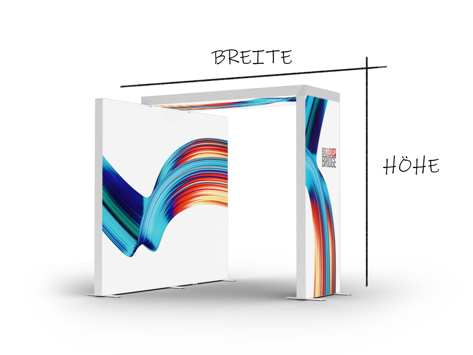 Die BIG LEDUP® Bridge ist eine innovative Lösung zur Verbindung eines freistehenden Rahmens (Breite: 100cm; Höhe: wahlweise 200cm, 230cm, 248cm oder 298cm) mit einem bestehenden BIG LEDUP® System. Dies erfolgt über einen oben liegenden Brückenrahmen mit ebenfalls 100cm Breite und einer Brückenlänge von 200cm, 230cm, 248cm oder 298cm.