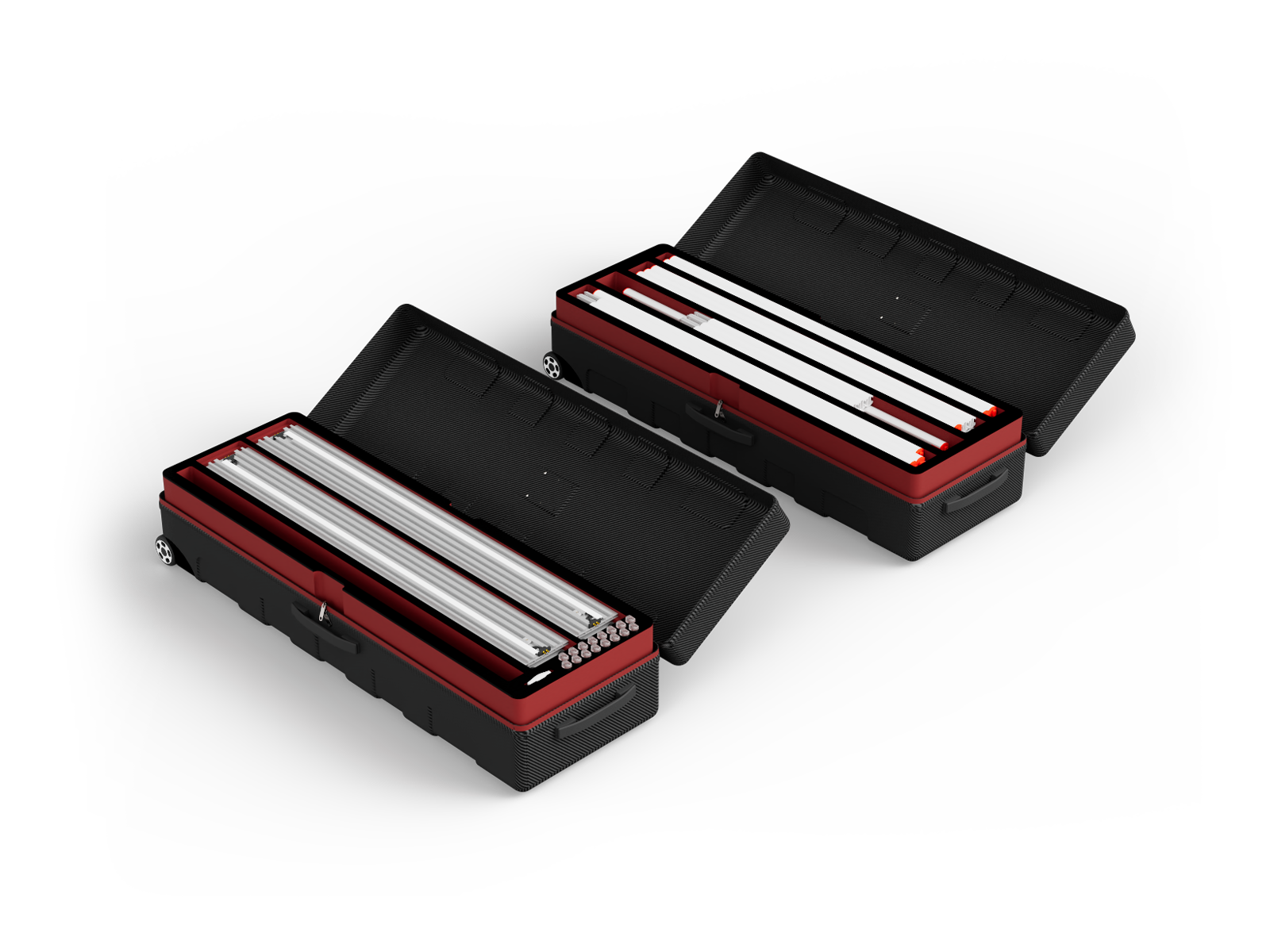 Das REAL BIG LEDUP™ Startmodul ist in zwei handlichen ABS-Hartschalenkoffer mit nur 120cm Länge, max. 40cm Breite und max. 31cm Höhe verpackt und lässt sich so problemlos in jedem PKW oder, in Verbindung mit anderen Systemen, auf einer kostengünstigen Europalette transportieren.