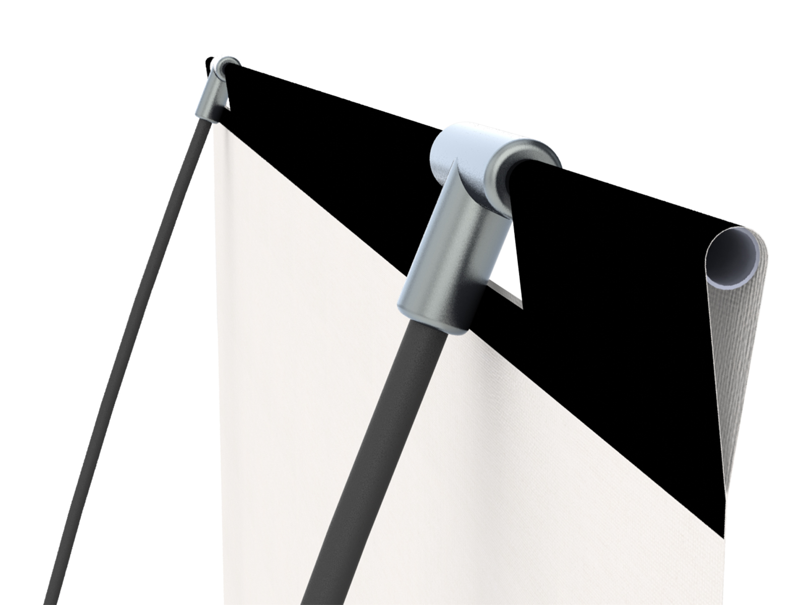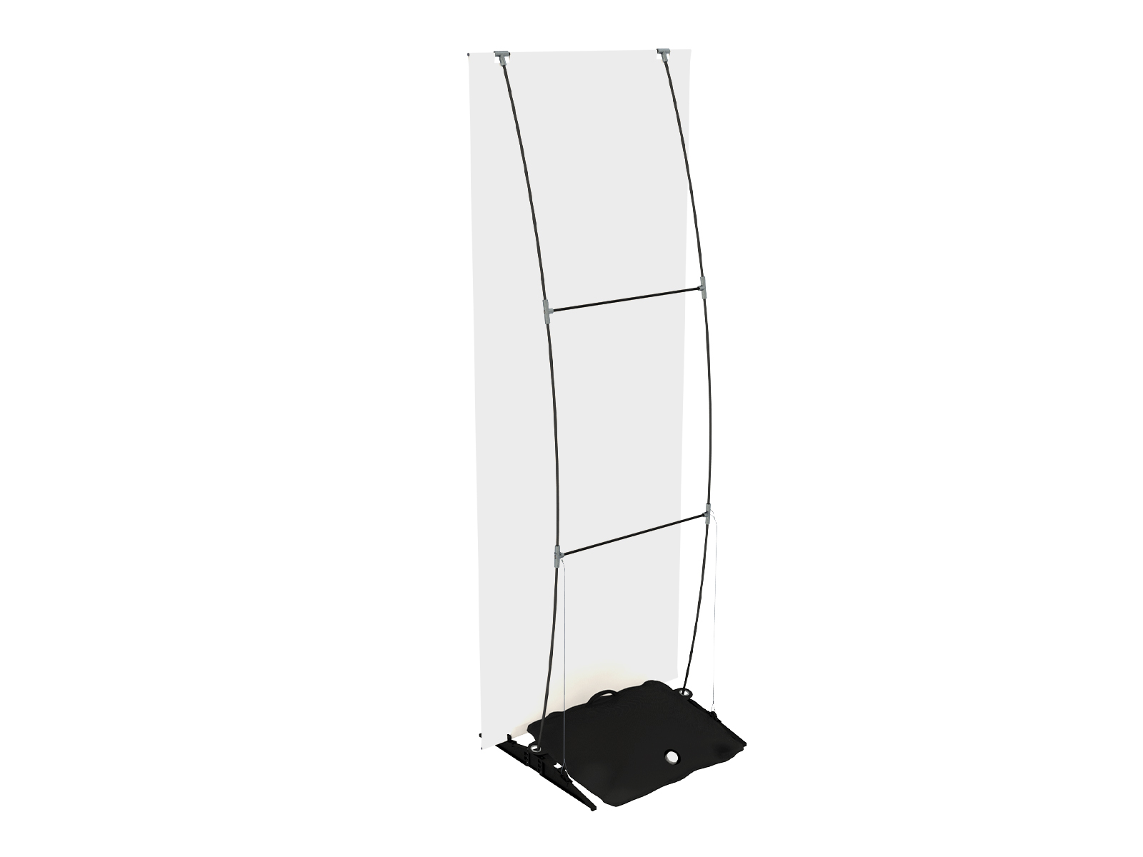 Die selbst-arretierenden Fußteile werden aufgeklappt. Die Struktur aus steckbaren Glasfaserstäben und Aluminiumverbindern wird zusammengesteckt. Die Stahlseile werden in den Haken eingehängt und arretiert. Das Paneel einhängen, die zwei Stützprofile auf den Fußteil legen und den Wassersack darüber legen – fertig ist das Display.