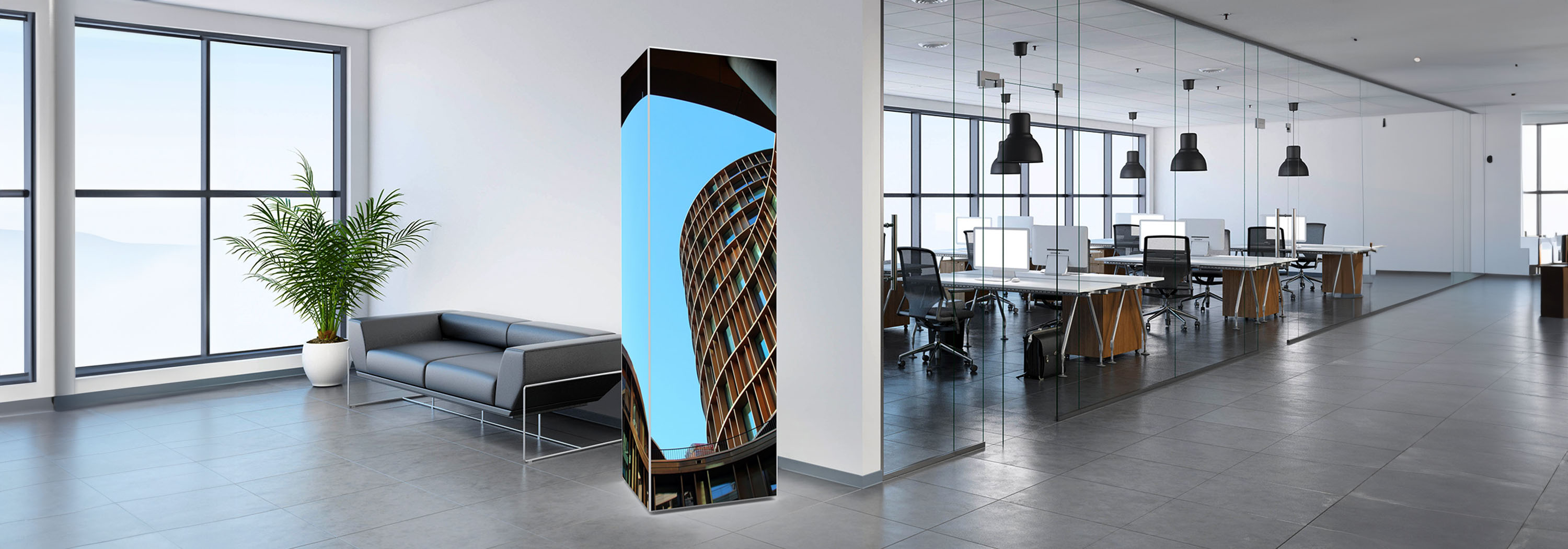 Die Multi Tower Profile aus silber eloxiertem Aluminium können ganz nach ihre Wünsche angefertigt werden - beleuchtet oder unbeleuchtet.